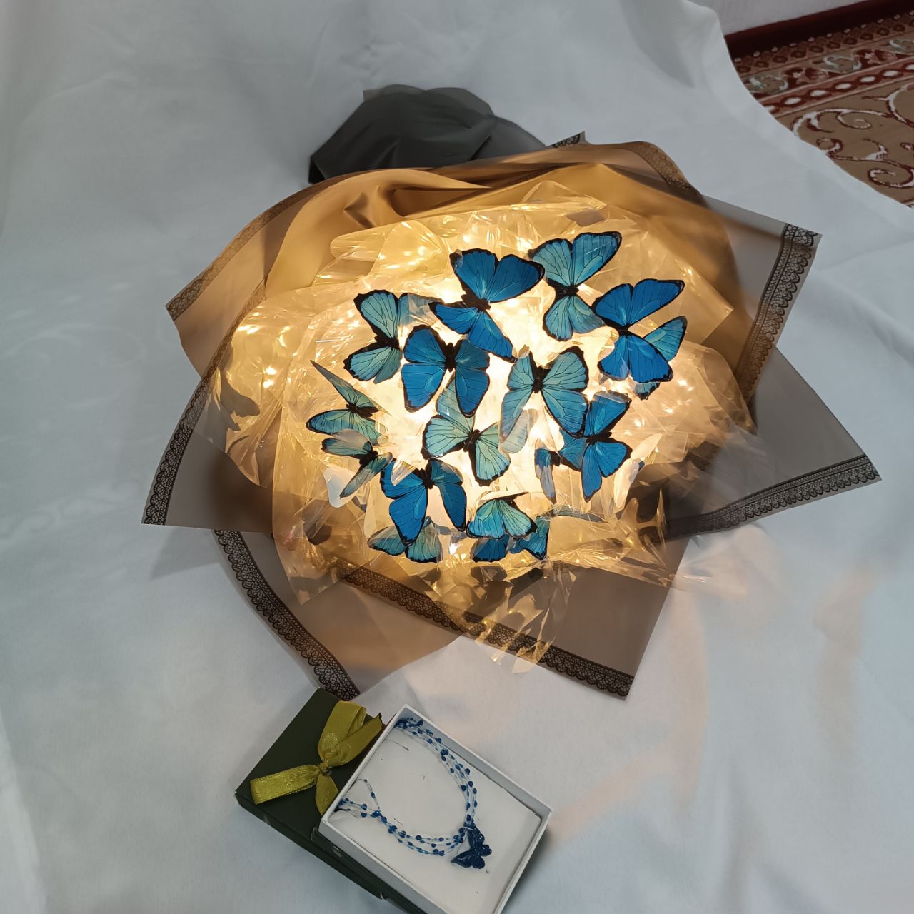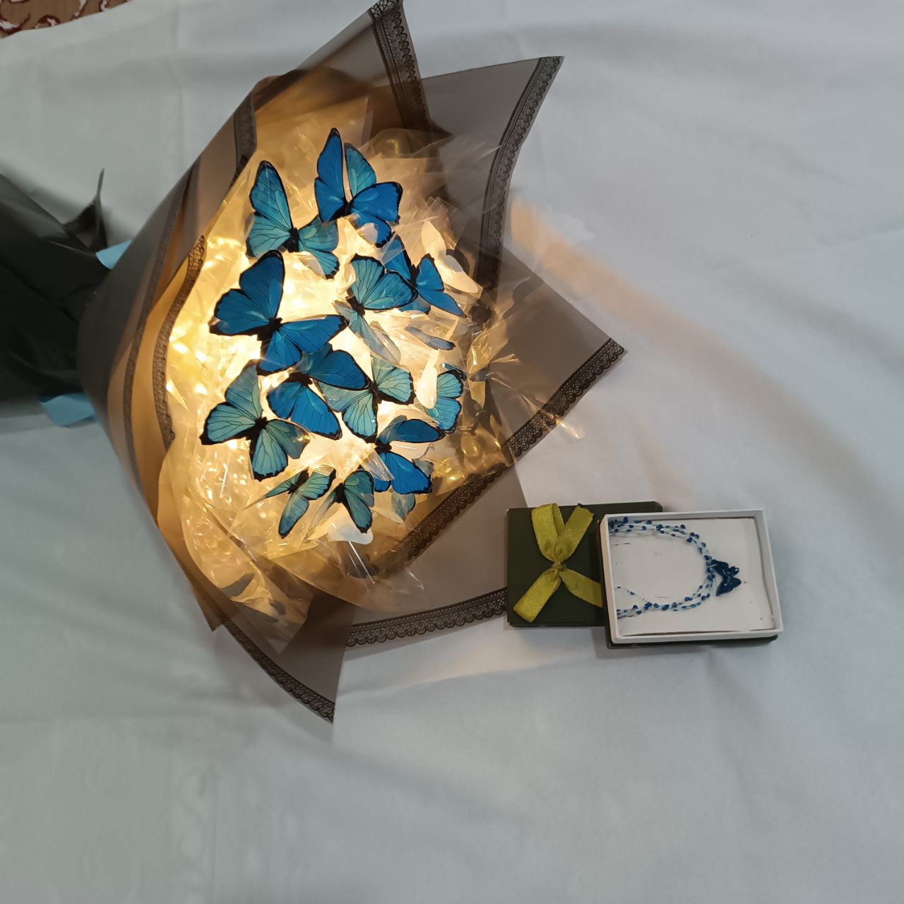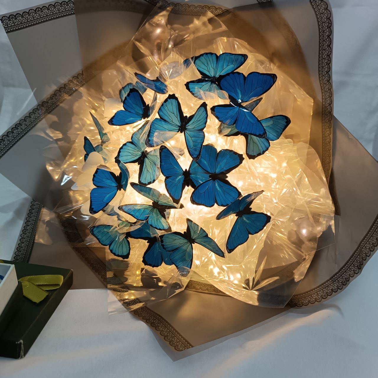 این دسته گل شامل شاخههای پروانهای رنگی است که با چراغ LED ریسهای تزئین شده و در رنگها و اندازههای مختلف قابل سفارش است. این دسته گل به صورت اماده نیستش و. با درخواست شما آمده خواهد شد